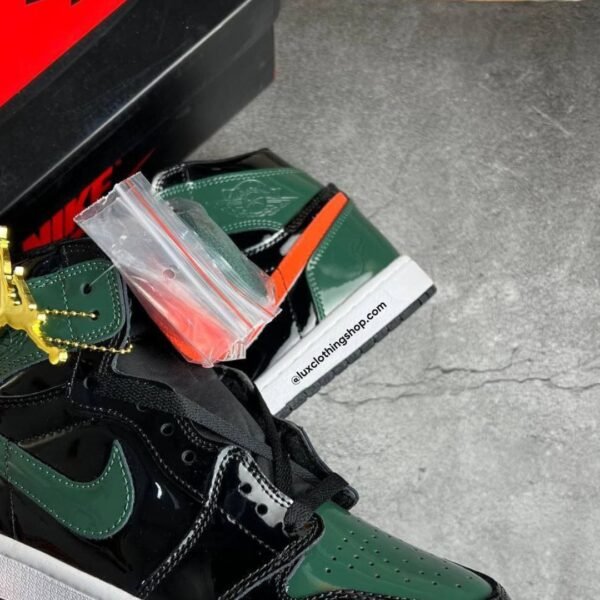They have a patent black leather upper with green leather overlays on the heel, collar, and toe box. They also have embossed Wings details, a quilted tongue, and MIA and 305 lettering on the inside of the tongue.