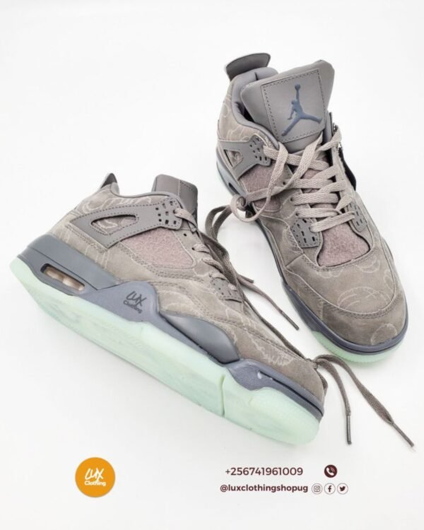 The KAWS x Air Jordan 4 features a buttery premium suede upper in smooth and heathered textures, all drenched in a tonal grey colorway. KAWS hand graphics are etched into the upper as well, along with the matching hang tag. The midsole and upper “Wings” are also wrapped in suede. Finally, a glow in the dark sole completes the look.