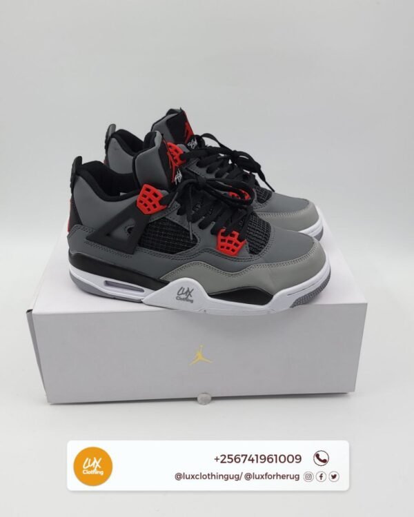 The Air Jordan 4 Retro OG “Infrared” is a classic sneaker that features a sleek design with a mix of black, white, and grey colors. The upper is made of premium black leather and mesh panels, with white accents on the midsole, laces, and Jumpman logo. The grey heel tab and speckled grey midsole add subtle detailing to the shoe’s overall design.