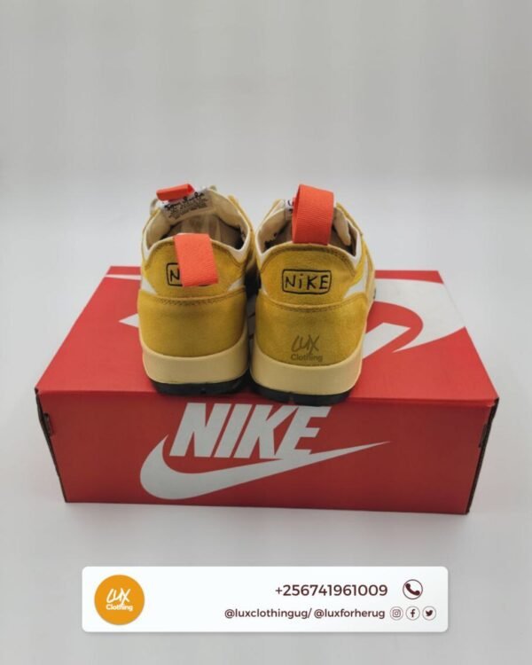 The upper of the sneaker is primarily made of a dark yellow-brown suede with lighter yellow accents on the toe and heel. The Nike Swoosh is made of white leather and is outlined in black stitching. The tongue is made of a mesh material with a rubber Nike logo patch. The sneaker also features a yellow-brown leather heel tab with “NIKE” and “TOM SACHS” branding.