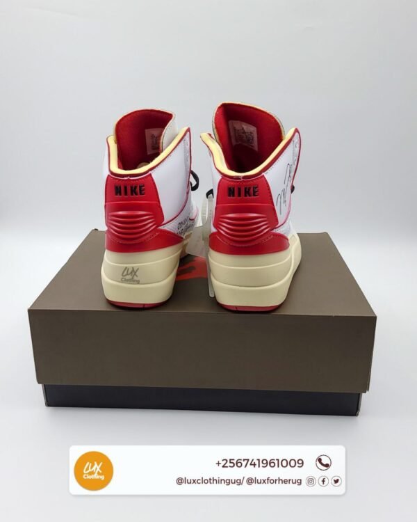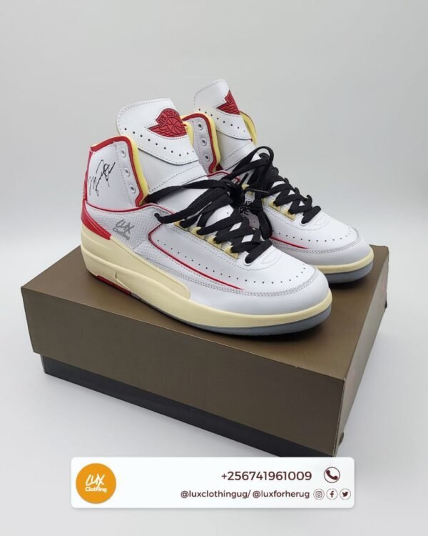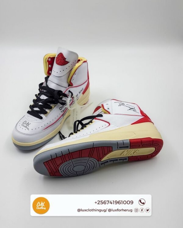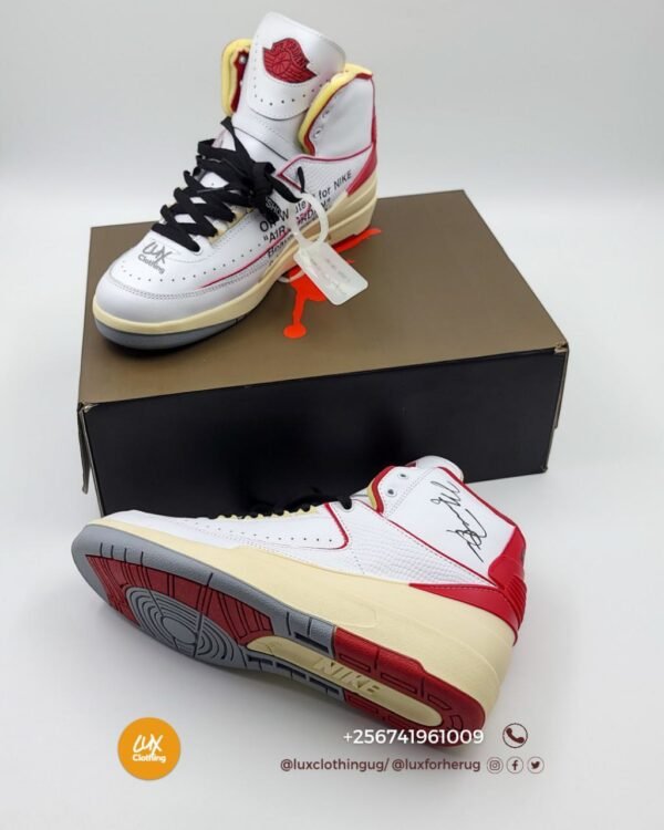 The shoe features a predominantly white leather upper with hits of red on the collar, midsole, and outsole. The iconic Off-White branding is visible throughout, including the “AIR” lettering on the midsole, “SHOELACES” text on the laces, and the signature orange zip tie. The shoe also features a unique deconstructed design, with exposed foam and stitching giving it a raw and unfinished aesthetic. Overall, the Off-White Air Jordan 2 High SP “White/Red” is a striking and highly sought-after sneaker for both collectors and fashion enthusiasts.